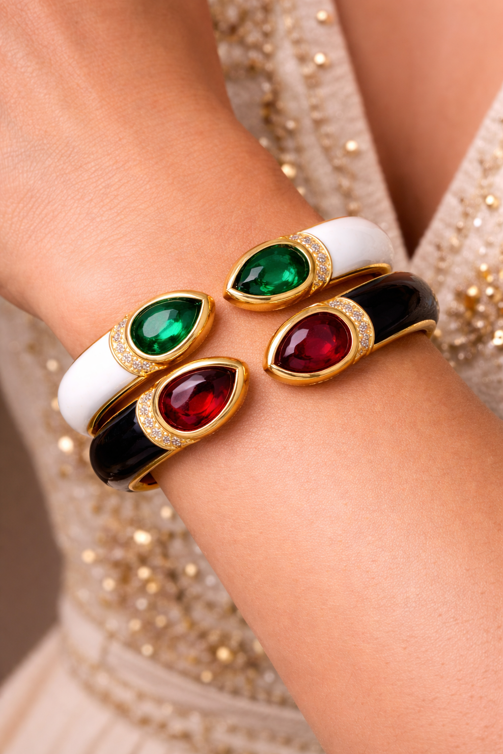 The gemstones are framed in gold with delicate pavé accents, while the inner lattice detailing adds depth and craftsmanship from every angle. Whether paired with a white or black enamel cuff, each combination balances drama and refinement.